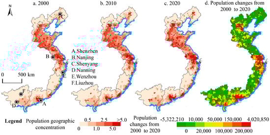 From 2000 to 2020, population changes and geographic concentrations in China’s coastal areas exhibited considerable spatial variation (Figure 3d). In the districts and counties of the Yangtze River Delta and the Pearl River Delta, the population has been increasing. However, in most districts and counties of the North China Plain, where the population geographic concentration is high, the population has been decreasing. The districts and counties in the Pearl River Delta have relatively low population geographic concentrations. Major urban centres experiencing population growth include Beijing, Shanghai, Guangzhou, Shenzhen, and Nanjing, with increases also observed in the districts of Shenyang, Nanning, Fuzhou, Wenzhou, and Liuzhou. These findings suggest that the three major urban agglomerations in China (Beijing–Tianjin–Hebei, the Yangtze River Delta, and the Pearl River Delta) are likely to attract even larger populations in the future.