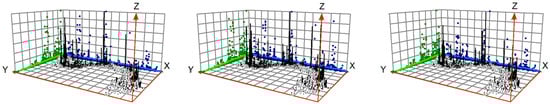 Trend analysis of per capita ecosystem service values in 2000, 2010, and 2020. Black represents the trend surface data distributed according to geographic space, green represents the distribution projected according to longitude, and blue represents the distribution projected according to latitude.