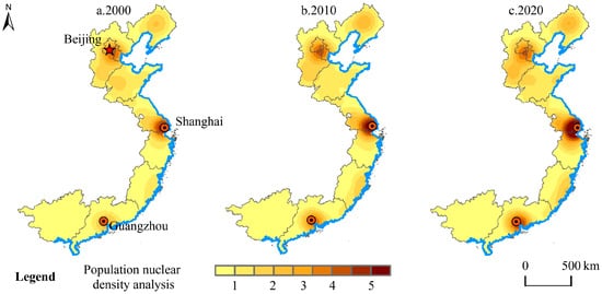 Through trend surface analysis, the spatial distribution patterns of the population can be observed more intuitively. The results of the trend surface fitting (Figure 4) indicate that the population density along China’s coastal areas shows a spatial orientation pattern of “high–low–high–low–high” from north to south, with significant peaks in three areas (Beijing, Shanghai, and Guangzhou). These locations are regions with relatively high population densities. To gain a deeper understanding of the spatial changes in population along China’s coastal areas, we created a county-level population density kernel map (Figure 5). This study reveals that the population distribution in China’s coastal areas has a distinct hierarchical structure characterized by a high-density distribution in the three major city clusters and localized concentrations around provincial capitals, whereas the inland areas present a scattered distribution pattern, which forms a high-density population distribution pattern centred on Beijing, Shanghai, and Guangzhou.