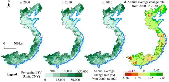 Spatial distribution of per capita ecosystem service values in 2000, 2010, and 2020.