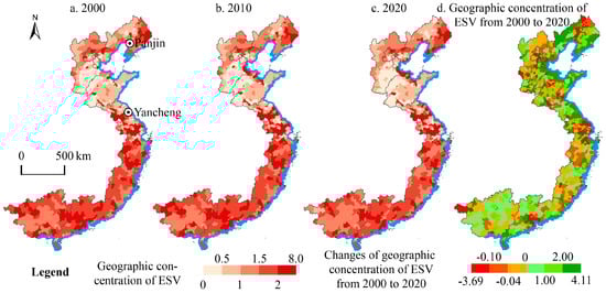 An analysis of the changes in eco-geographic concentration (Figure 7d) from 2000 to 2020 shows that 446 county units along China’s coast experienced a decline in eco-geographic concentration, with notable decreases in several regions, such as Guangzhou–Shenzhen, Shanghai–Nanjing, and Shenyang–Panjin. Conversely, 638 county units showed an increase in eco-geographic concentration, primarily in Guangxi, Guangdong, Liaoning, northern Jiangsu, and coastal Shandong.