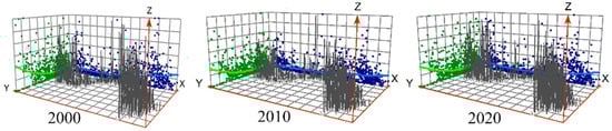 Trend analysis of population density in 2000, 2010, and 2020. Black represents the trend surface data distributed according to geographic space, green represents the distribution projected according to longitude, and blue represents the distribution projected according to latitude.