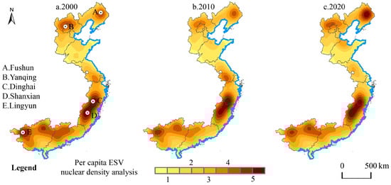 Kernel density analysis of per capita ESVs in 2000, 2010, and 2020.