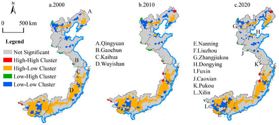 Local spatial autocorrelation of bivariate population geographic concentration and ecological geographic concentration in 2000, 2010, and 2020.