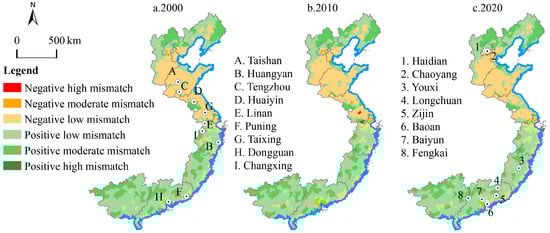 The number of mismatched counties has been increasing, rising from 85 in 2000 to 100 in 2010 and 103 in 2020. Specifically, in 2000, there were 20 negatively mismatched counties and 65 positively mismatched counties. By 2010, the number of negatively mismatched counties had increased to 24, whereas the number of positively mismatched counties had increased to 76. In 2020, there were 28 negatively and 75 positively mismatched counties in coastal areas, accounting for 10% of the total number in the research area.