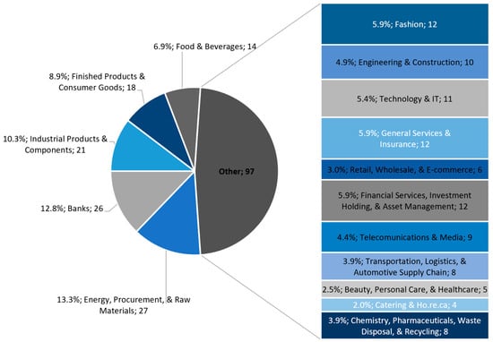 The sample for this study was drawn from the “Sustainability Leaders 2023” list published by Lab24, comprising 240 Italian businesses recognized by Il Sole 24 Ore and Statista for their sustainability based on sustainability disclosures [57]. Focusing on this database offered several advantages. Firstly, numerous companies on the list must comply with Legislative Decree 254/2016 regarding non-financial information (NFI) disclosure. Secondly, the ranking issuers had already vetted the documents, ensuring high disclosure quality. Finally, the voluntary involvement of these companies indicates their commitment to transparency in sustainability reporting. The study concentrated on 203 large companies with revenues exceeding EUR 100 million, spanning 16 sectors. This focus on larger companies is based on the assumption that their disclosure level is likely higher than that of smaller firms, which may not provide as-detailed SRs.