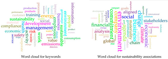 Figure 2 (right) presents a word cloud including 50 phrases that exhibit a robust association with the terms “sustainability” and “sustainable”, shown by a Pearson’s correlation coefficient of no less than 0.85 (see Table A2 in the Appendix A for further details). The phrases “environment and stakeholders” (present in 10 of 16 sectors), “goal” (9 of 16 industries), “business” (8 of 16 sectors), and “social, financial, economic, company, commitment, climate, change, and Agenda” (7 of 16 industries) represent the most frequently identified linguistic associations. Other noticeable terms in the word cloud include “report, materiality, global, chain, analysis, aligned, and governance.” Additional terminology associated with the cloud includes “ethics, eligible, activity, SDGs, promote, footprint, energy, distributed, corporate, contribute, compact, community, committee, biodiversity, balance, approach, and adaptation.” Perspective-oriented terms such as “mission”, “future”, “challenges”, and “achievement” are infrequent, occurring in just 3 out of 16 sectors.