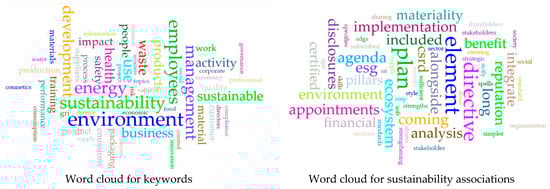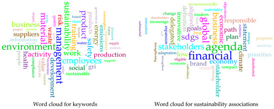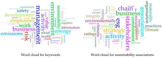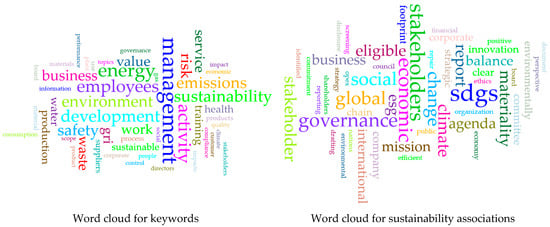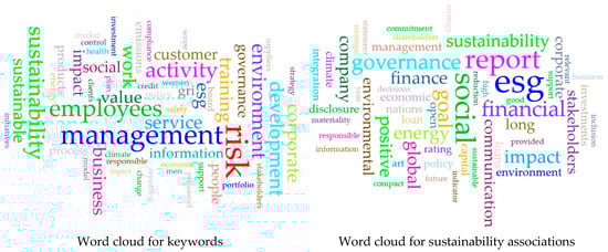 An examination of phrases closely associated with “sustainability” and “sustainable” elucidated other aspects of the cluster’s sustainability strategy (Figure 3, right). ESG, SDGs, and SFDR are intricately connected to the responsible corporate practices outlined in sustainability guidelines. The apparent association between “sustainability” and “report, disclosure, and rating” underscores the need for transparency across all clusters. The terms “financial”, “finance”, and “economic” highlight the relationship between sustainable development and financial strategies.