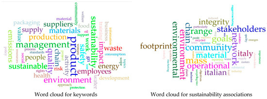 The gathered data underwent purification through the elimination of numerals, articles, interrogative terms, prepositions, and commonly reiterated yet extraneous words, including “year(s)”, “group”, “s.p.a.”, “total”, “figure”, “table”, “appendix(ces)”, “Italy”, “Italian”, “data”, “euro”, “million”, “billion”, “report”, “company”, “bank”, “financial”, “statement”, “global”, “consolidated” and so on. Terms formerly in plural form were converted to singular (e.g., “plant”, “customer”, “activity”, “risk”). Furthermore, suffixes were eliminated. Data cleansing is a crucial phase in content analysis to guarantee that the outcomes represent authentic patterns rather than extraneous noise, as highlighted by Neuendorf [59].