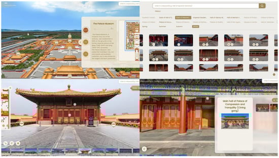 The Forbidden City is one of China’s most famous tangible cultural heritage sites. The case selected for this study is the “Panorama of the Forbidden City” virtual heritage tourism platform (https://pano.dpm.org.cn/#/, accessed on 20 August 2024) (Figure 3). This project, co-developed by the Palace Museum and a professional mapping team, integrates browsing, navigation, an encyclopedia, and interaction into one well-known product. The platform uses GPRS navigation, LBS positioning, and 360-degree panoramic technology to accurately capture information on over 600 open areas, buildings, exhibition halls, and service facilities within the Forbidden City. It also offers special features like auspicious symbols of the Forbidden City, beautiful images, and thematic routes, all of which have been well received by users. Users can enjoy an immersive 360° panoramic experience of the open areas of the Forbidden City and explore parts that have not yet been opened to the public. Selecting the right experimental platform is crucial, and we carefully considered five factors: