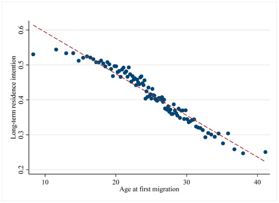 Relationship between the age at first migration and migrants’ long-term residence intention.