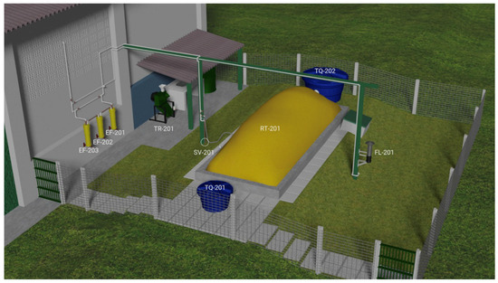 Low-cost pilot plant developed for biogas and biofertilizer production from food waste on experimental biorefinery of organic solid waste. TR-201: food grinding machine; TQ-201: feeding tank; RT-201: pilot biodigester; TQ-202: storing biofertilizer tank; SV-210: safety valve; FL-201: flare; EF-201: filter 1; EF-202: filter 2; EF-203: filter 3. Source: [28].