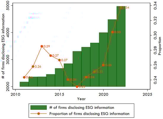 As rules and regulations on ESG information disclosure have also become stricter, the number of listed Chinese companies releasing ESG reports has gradually increased [46]. According to statistics from the Chinese Association for Public Companies, the number of companies disclosing ESG activity-related information has increased from 565 in 2011 to 1714 in 2022, raising the proportion of all listed companies from 24% to 34%. Although the overall number is encouraging, the ratio of ESG information disclosure remains low as two-thirds of listed firms did not disclose ESG information in the 2010s and early 2020s. Figure 1 shows the proportion of ESG-disclosing firms from 2010 to 2022.