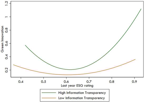This paper also found that ESG information transparency boosts the relationship. As hypothesized and shown in Figure 2, the U-shaped relationship appears to be strengthened among firms with higher ESG information transparency Our multifaceted information transparency indicator, developed using five metrics, empirically demonstrates that information transparency significantly strengthens the positive impact of ESG activities on green innovation, thereby enriching the current understanding of ESG dynamics. Although information transparency has been widely recognized as a crucial factor in enhancing corporate sustainability performance [58,59], previous studies have often overlooked its role in shaping the complex relationship between ESG activities and green innovation, including the U-shaped relationship. Our results align with existing studies, indicating that information transparency fosters investment and resource allocation toward green innovation by reducing information asymmetry and uncertainties between firms and stakeholders [10,45].
