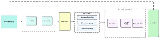 The market for 3D printing is a rapidly expanding industry. A wide range of thermoplastic compounds, including recyclable ones, may be used to create printable filaments [29]. Such polymeric material recycling usually involves several steps, including material separation, purification and decontamination, grinding, remelting, and extrusion. Figure 1 depicts the predominant methodology used for recycling in AM. Several recycling processes for 3D printing filaments are described in this section.