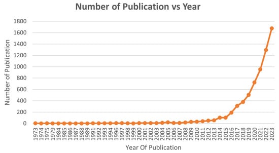 Number of publications vs. the year—generated from the Scopus Database [‘TITLE-ABS-KEY (((additive AND manufacturing) OR (3d AND printing)) AND (recycling OR sustainable OR (material AND waste)))’].