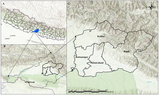 Location of the study area (C) within Chitwan district (B) of Nepal (A).