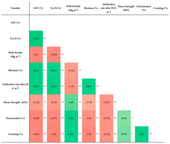 The relationships between soil physicochemical, hydraulic, and mechanical properties were studied by Spearman’s Rho coefficient, and the results are reported as a heatmap matrix in Figure 1. The strong correlation between all the variables is evident; in particular, the strongest relationships were observed between the SOC and all the other variables. This result is attributable to the increase in SOC induced by some mulching applications, which in turn positively influenced soil fertility in the physical–chemical (total N, bulk density and moisture), hydraulic (infiltration rate), and mechanical (shear resistance, deformation and cracking) parameters.