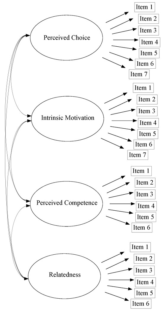 Examples of previous research include McAuley et al. (1989), who investigated four subscales of the IMI (interest/enjoyment, perceived competence, effort, and felt pressure and tension) in the context of physical activity to validate the hypothetical factor structure [41]. The initial model included 18 items. Item deletion was assessed using coefficient alpha, resulting in one item being removed from the interest/enjoyment scale (“While playing this basketball game, I was thinking about how much I enjoyed it”) and one item removed from the perceived competence scale (“I am satisfied with my performance at this game”), resulting in a 16-item inventory. Confirmatory factor analysis (CFA) was conducted in two phases to assess the two models using maximum likelihood estimation on the Likert-type scale responses. The CFA results indicated that the 16-item model had stronger internal consistency than the 18-item model, and the authors encouraged additional validation of the measures in sports and social sciences [41].