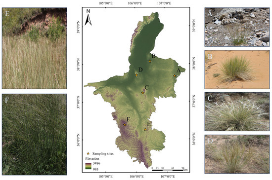 Geographical map of the study area (Ningxia, northwest China) showing the six locations (A–F) in three different steppe ecosystems where the rhizosphere of Stipa species was sampled for their soil microbial communities.