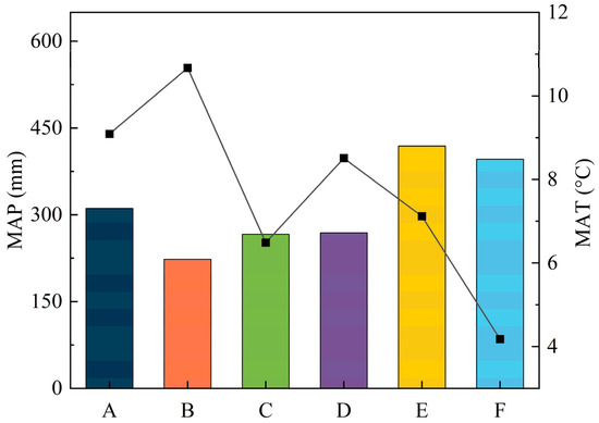 Average temperature and precipitation data of the six sampling sites in the last 30 years. A—Stipa bungeana site; B—S. caucasica subsp. glareosa site; C—S. tianschanica var. gobica site; D—S. breviflora site; E—S. grandis site; F—S. przewalskyi site. The bar graph shows the mean annual precipitation, and the line graph shows the mean annual temperature.