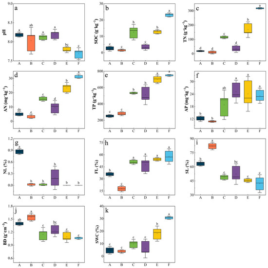 Boxplots of 11 rhizospheric soil physicochemical properties across the study area (Ningxia, northwest China). In each boxplot, the hollow dot represents the mean value (n = 3). pH: potential of hydrogen; SOC: soil organic carbon; TN: total nitrogen; AN: ammonium nitrogen; TP: total phosphorus; AP: available phosphorus; NL: clay particles; FL: silt particles; SL: sand particles; BD: bulk density; SWC: soil water content. Different letters indicate significant differences between sites (p < 0.05), and the same applies hereafter. Note: The abscissa in the figure has the following meaning, A: Stipa bungeana site; B: S. caucasica subsp. glareosa site; C: S. tianschanica var. gobica site; D: S. breviflora site; E: S. grandis site; F: S. przewalskyi site. In desert steppe, S. bungeana, S. caucasica subsp. glareosa, S. tianschanica var. gobica, and S. breviflora are dominant; in typical steppe, S. grandis dominates; and in meadow steppe, S. przewalskyi is dominant. And the same applies hereafter. (a) soil pH; (b) soil organic carbon; (c) total nitrogen; (d) alkaline hydrolysis nitrogen; (e) total phosphorus; (f) available phosphorus; (g) clay fraction; (h) silt fraction; (i) sand fraction; (j) soil bulk density; (k) soil moisture content.