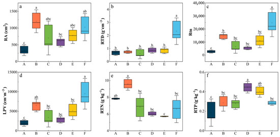 Root traits of six Stipa species corresponding to the six sampled steppe sites. RA: root surface area; RTD: root tissue density; RTN: number of tips; LPV: total root length; RTN: total nitrogen of roots; RTP: total phosphorus of roots. (a) root surface area; (b) root density; (c) root tip number; (d) total root length; (e) total nitrogen in roots; (f) total phosphorus in roots.