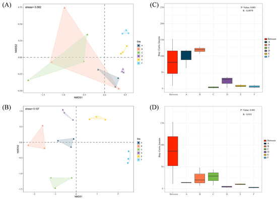 NMDS and ANOSIM analysis of rhizospheric bacteria (A,C) and fungi (B,D) of different Stipa species corresponding to the six sampled steppe sites.