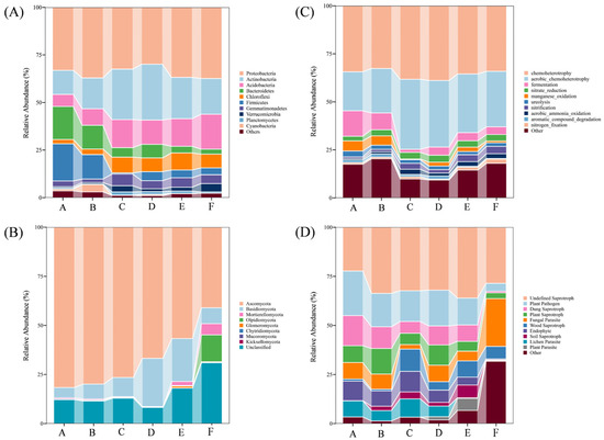 Relative abundances of bacterial (A,C) or fungal (B,D) phyla and their functional gene composition in the rhizosphere of six Stipa species corresponding to the six sampled steppe sites. (A,B) represent the dominant bacterial phyla, while (C,D) indicate the predicted functional genes.