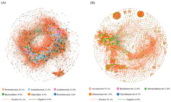 Network structure analysis of rhizospheric bacteria (A) and fungi (B) of Stipa plants (six species pooled).