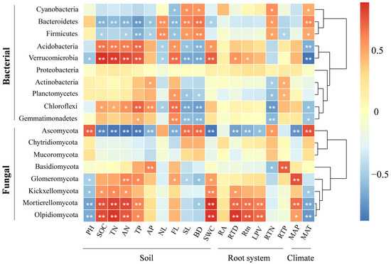Pearson’s correlation analysis between the relative abundance of dominant bacterial and fungal phyla and climatic factors, rhizospheric soil physicochemical properties, and root traits of Stipa plants (six species pooled). * p < 0.05; ** p < 0.01. pH: potential of hydrogen; SOC: soil organic carbon; TN: total nitrogen; AN: ammonium nitrogen; TP: total phosphorus; AP: available phosphorus; NL: clay particles; FL: silt particles; SL: sand particles; BD: bulk density; SWC: soil water content; RA: root surface area; RTD: root tissue density; Rtn: number of tips; LPV: total root length; RTN: total nitrogen of roots; RTP: total phosphorus of roots; MAT: mean annual temperature; MAP: mean annual precipitation.