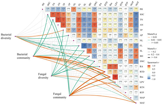 Mantel analysis of environmental factors and the rhizospheric microbial diversity and community composition of Stipa plants (six species pooled). * p < 0.05; ** p < 0.01; *** p < 0.001. PH: potential of hydrogen; SOC: soil organic carbon; TN: total nitrogen; AN: ammonium nitrogen; TP: total phosphorus; AP: available phosphorus; NL: clay particles; FL: silt particles; SL: sand particles; BD: bulk density; SWC: soil water content; RA: root surface area; RTD: root tissue density; Rtn: number of tips; LPV: total root length; RTN: total nitrogen of roots; RTP: total phosphorus of roots; MAT: mean annual temperature; MAP: mean annual precipitation.