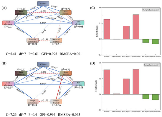 Structural equation model showing the contributions of climate, soil, and roots to rhizospheric bacteria (A,C) and fungi (B,D) of Stipa plants (six species pooled). * p < 0.05; ** p < 0.01; *** p < 0.001. Climate includes MAP and MAT; root chemistry includes RTN and RTP; root physics includes RA, RTD, Rtn, and LPV; soil chemistry includes pH, SOC, TN, AN, TP, and AP; and soil physics includes NL, FL, SL, BD, and SWC. Blue represents positive correlation, red represents negative correlation, and significance is indicated by “*”.