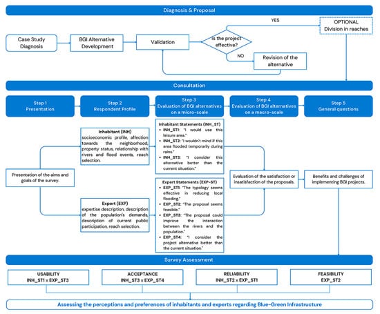 The “Consultation” stage aims to present the BGI alternatives to respondents and obtain their feedback. For this purpose, it is necessary to identify the key stakeholders who will contribute to the evaluation. Therefore, this framework entails bringing together the inhabitants of the watershed, who experience specific problems in the studied region, and experts with technical knowledge, enabling a comparison of perspectives. Once the target audience is identified, the consultation stage begins with a survey divided into five sections: (1) presentation, (2) respondent profile, (3) evaluation of BGI alternatives on a micro-scale, (4) evaluation of BGI alternatives on a macro-scale, and (5) general questions. The survey questions were included in the Supplementary Material S1.