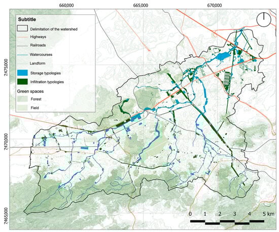 Finally, the fourth element is the smaller-scale open spaces, such as squares, parks and sports areas, to improve public enjoyment within the watershed. Additionally, the original PDMAP reservoirs presented by Oliveira et al. [3] were classified by typology, storage capacity, and design. These reservoirs can be modified and represented as BGI strategies, such as detention or retention basins, without altering their total storage capacity. These adaptations aim to incorporate social aspects into the project, departing from the mono-functionality initially planned.