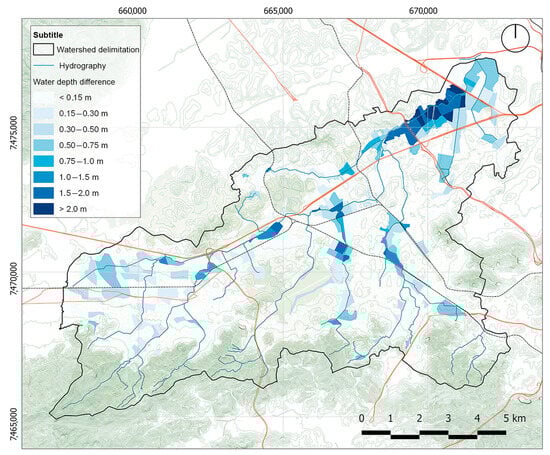 Compared to Oliveira’s drainage project [3], the BGI Alternative showed a complete reduction in flood depths between 1.0 and 2.0 m. However, it showed a minor reduction in the densely populated areas where rivers are confined and open spaces are limited, which constraints the overall effectiveness of the BGI Alternative. Nevertheless, it showed a 40.75% improvement in flood depths compared to the primarily grey infrastructure measures adopted by Oliveira et al. [73]. The “water depth difference map” (Figure 4) illustrates the flood depths that have been eliminated through the reallocation for storage or retention areas. The distribution of BGI strategies ameliorates the immediate urban surroundings and reduces flood occurrence at river confluences.