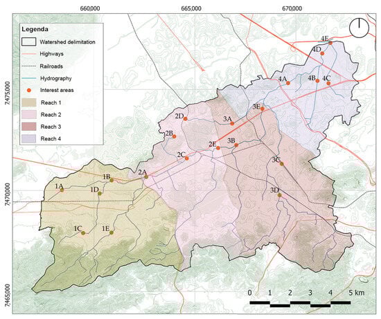 Given the size of the watershed, approximately 108 km2, using a macro-scale approach would hinder the presentation of the BGI proposals, especially due to the need for spatial identification by residents. Consequently, we divided the Acari River Watershed into four reaches based on the location and physical characteristics of each neighborhood. Following this subdivision, five areas of interest were selected within each of the four reaches. Public perceptions were then consulted through graphic representations that illustrate BGI interventions on a micro-scale, resulting in a total of 20 areas (Figure 5). The selection of the 20 areas aimed to demonstrate different landscape representations across neighborhoods and explore BGI applications in urban environments. Factors considered in the selection included river characteristics, surrounding settlements, existing urban infrastructure, and vegetation cover. Respondents evaluated five areas within each reach based on their familiarity. Specifically, Reach 1 comprises areas 1A, 1B, 1C, 1D, and 1E; Reach 2 includes areas 2A, 2B, 2C, 2D, and 2E; Reach 3 contains areas 3A, 3B, 3C, 3D, and 3E; and Reach 4 includes areas 4A, 4B, 4C, 4D, and 4E. The BGI and urban restoration strategies for these reaches are presented in Table 1.