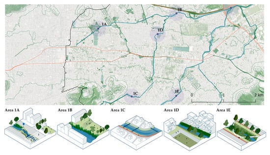 Reach 1 (Figure 6) is in the upstream region of the Acari River Watershed, where most river sources are found. The available open green spaces in this area enhance water dynamics, resulting in reduced flood depths. However, this region also includes a transitional zone between natural and urban environments, where the natural watercourse has been channelized or culverted in some areas. Reach 1 is predominantly residential, characterized by formal housing and few irregular settlements. The five areas of interest selected in this reach are situated between the Marinho, Catarino, and Piraquara rivers. Area 1A features a river that is partly channelized and partly enclosed in a gallery. This area presents an opportunity to apply tactical urbanism strategies to enhance environmental awareness and emphasize the importance of river preservation. Area 1B involves transforming an existing parking lot into a vegetated detention basin, creating a multifunctional space. The proposal includes additional strategies to restore the riverbanks. We propose to transform Area 1C, currently a skate park, into a PDMAP reservoir. We also planned to convert a sports court in Area 1D, located in a slum, into a detention basin while preserving its current social function. This strategy is complemented by riverbank replanting to mitigate surface runoff. Conversely, Area 1E is designated for riverbank recovery through the introduction of vegetation cover and improvements in urban mobility.