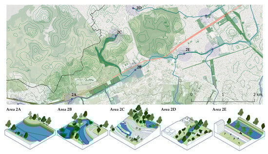 Areas of interest of Reach 2, which contains BGI strategies such as floodable park (2B and 2E), detention basins (2D and 2E), retention basins (2A and 2C), wetlands (2B), replanting riverbanks (2D), and urban greening (2C and 2E).