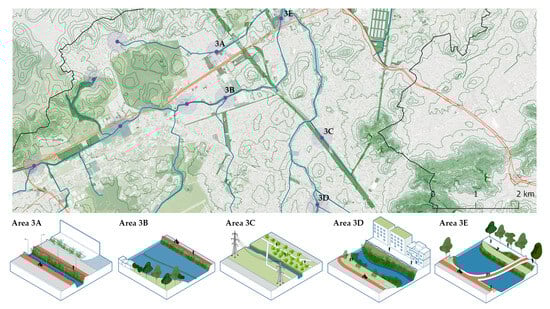 The BGI project focuses on the interconnection of four main elements. The first one consists of preserving the remaining forest fragments upstream, which support local fauna and flora, protect river sources, and maintain vegetated areas that contribute to the watershed permeability. The second element is the fluvial park proposed by Oliveira et al. [3], situated along the main channel of the Acari River. The third element encompasses the tributaries of the main river, forming branches of the green and blue corridor. In this sense, the park’s secondary gutter enhances hydraulic performance while also providing leisure and recreational spaces for the inhabitants. This work adopted some premises, such as maintaining vegetation cover, replenishing the riparian vegetation, and encouraging visual contact with the rivers. The plan includes features that allow residents to access and engage with riverbanks for temporary activities. Additionally, the proposal incorporates general urban restoration strategies, such as pedestrian bridges and cycle paths, to enhance urban mobility and provide diverse landscape views. Temporary urban interventions, known as tactical urbanism, were included to provide visual continuity and raise awareness of the rivers’ environmental significance. These interventions were also complemented with urban street furniture and recreational areas, introducing additional activities and functions to the riverside areas.