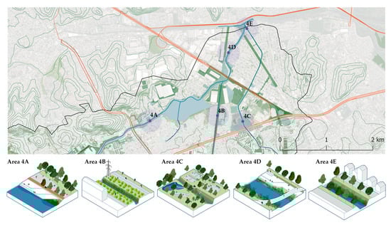 Finally, Reach 4 (Figure 9) is the most critical of the four reaches. It comprises residential, commercial, and industrial areas, with many irregular settlements along the riverbanks. The main challenges in this reach are flooding, which can exceed 2 m, and severe pollution due to irregular sewage dumping, increasing the risk of water-borne diseases. The areas of interest are situated between the Acari, dos Cachorros I, and dos Cachorros II rivers. Area 4A, which experiences the most critical flood depths, requires the resettlement of the population to mitigate physical and financial damage. The BGI proposal includes creating a fluvial park, reintroducing urban greening, and implementing riverbank replanting to enhance water infiltration and storage. Area 4B proposes urban agriculture within the current power line easement strip. Area 4C has significant space available for integrating urban drainage. The proposal includes a series of multifunctional detention basins and a retention basin designed as a contemplative lake. Area 4D involves establishing a fluvial park following the resettlement of irregular housing along the riverbanks. Finally, Area 4E aims to recover the vegetation along the currently canalized riverbanks to improve amenity and thermal comfort.