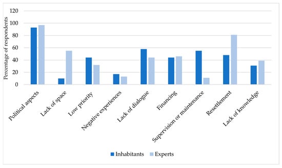 The final section of the survey identified the strengths and barriers of BGI implementation. First, respondents were asked to select factors that could hinder the implementation of BGI in urban environments, with the option to select multiple responses. The results showed that political issues were equally perceived by both groups as the major barrier to BGI implementation. In contrast, experts identified the lack of space as a significant challenge, whereas most of the inhabitants did not perceive it as a major concern. This disparity may reflect a limited awareness of the watershed’s spatial constraints among the community. This finding diverges from the interviews conducted by Drosou et al. [5] in which the community acknowledged the lack of space as a challenge to be addressed, while policymakers did not recognize it. Subsequently, the low prioritization of sustainable urban drainage solutions, especially when compared to other urgent issues, revealed only minor differences between the two groups. The limited responses regarding “negative past experiences” were expected, given that the municipal government typically prioritizes conventional flood control methods, thereby constraining opportunities for exploring BGI alternatives. Both groups also recognized the lack of dialogue as a significant concern, underscoring the necessity for more community-based solutions. Interviews conducted by O’Donnell et al. [14] similarly identified ineffective communication as a socio-political barrier to BGI implementation. Additionally, in this research, funding difficulties were almost equally highlighted by both groups as a significant issue, corroborating findings from Drosou et al. [5] and O’Donnell et al. [14]. Meanwhile, the majority of residents emphasized concerns about insufficient supervision or maintenance. Finally, in comparison to the inhabitants, experts identified the necessity for resident relocation and lack of knowledge as greatest challenges. Figure 10 illustrates the limitations mentioned by both groups.