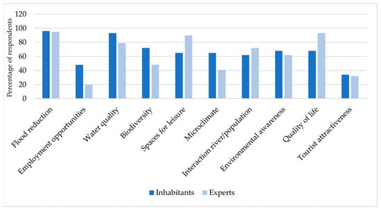 There is a growing tendency to integrate the natural and the human systems through local perspectives and participatory processes, replacing the traditional approach to flood mitigation [66]. This integration enables participants to identify locations, values, and perceptions about specific places [67], helping in decision-making processes and enhancing the sense of belonging to the neighborhood. Additionally, the inclusion and consultation of the inhabitants imply recognizing the role of community as an agent capable of contributing to more inclusive risk management [65]. However, residents’ perceptions and local knowledge are rarely included in integrated river management [59,66,68], which results from the general perception that multi-stakeholder initiatives slow down urban planning and policy development processes [62]. Some of the challenges to effective participation are the limited experience or preparedness in undertaking communication and engagement, the lack of a rigid communication plan, the failure to recognize the local context and features of the community, the difficulties in getting stakeholders to recognize the risks associated with urban flooding, and the poorly timed engagement activities [8]. Therefore, including residents’ perceptions through surveys allows managers to adapt plans to local preferences, improving inhabitants’ living conditions [66,69]. Zhao et al. (2014) used questionnaires and interviews to collect insights into city residents’ perceptions of 30 parks in Nanjing, China. Results revealed that interviewees had a strong preference for functional city parks, that is, structures able to act as a response to climate change, offer physical well-being, and provide socialization opportunities. Moreover, Atiqul Haq et al. [41] reviewed the public perception of urban green spaces, with a special focus on developing countries. The results show that different factors, such as education, gender, religion, and age influence residents’ perceptions of urban green spaces. Then, the authors argue that it is necessary to consider demographic and socio-economic dimensions of users’ perceptions and attitudes toward green spaces.