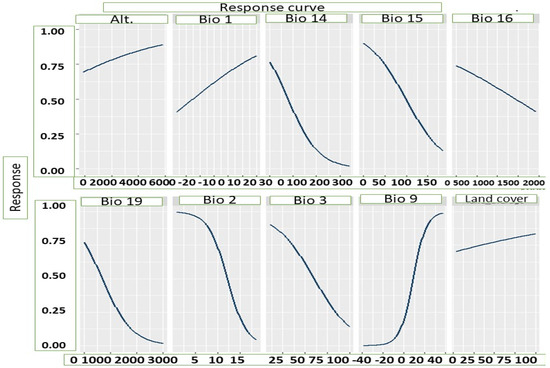 Response curves of the predictors used in modeling G. bimaculatus distribution.