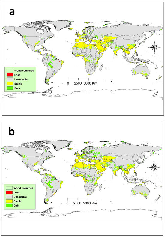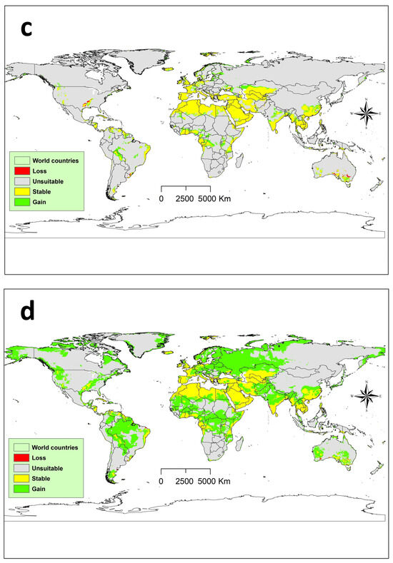 Regardless of the high- or low-emission scenarios, the stable area is projected to decrease in the far-future scenario compared to near-future projections (Table 4). It is noteworthy that under the high-emission scenario of the BCC-CSM2-MR model, there is a prediction of greater habitat gain compared to the low-emission scenario. In general, all scenarios investigated in the two global climate models showed that the gain area is predominantly in west and south Asia, central and northern Africa, central Europe, and some parts of North and South America (Figure 4).
