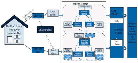 As a key instrument in achieving the global “dual carbon” goals, CEPT has gradually demonstrated its effectiveness in reducing pollution and carbon emissions in China. In economically developed regions such as the Yangtze River Delta [23], Yellow River Basin [24], and the Pearl River Delta, the carbon trading system is relatively mature, and its policy is analyzed. In contrast, the Pearl River–West River Economic Belt (PRWREB) exhibits significant differences in policy frameworks, industrial structure, and resource endowment, with economically developed cities like Guangzhou and resource-scarce areas like the Guangxi West River Baise [25]. These complex regional characteristics challenge the development and stability of clean energy supply while also exacerbating disparities in carbon and pollutant emissions, increasing the difficulty of coordinating regional emission reductions. The differences in economic development levels, energy structures, and policy responses among cities mean that CPT in the PRWREB requires an integrated approach to coordinate policy support, technological innovation, and regional synergies. First, this region is at a critical stage of industrial transformation and economic coordination, urgently needing CEPT to incentivize multi-level market mechanisms and policy levers to address the disconnect between clean energy supply and pollution and carbon reduction efforts. Second, due to its unique regional characteristics, the PRWREB is a key region for achieving national “dual carbon” goals and an ideal testing ground for studying the implementation effects of multi-level CEPT. Unlike market-driven regions such as the Yangtze River Delta and Beijing–Tianjin–Hebei, the carbon reduction pathway in the PRWREB should consider regional heterogeneity and explore how policy spillover effects can promote coordinated emission reductions in pilot and non-pilot regions. Finally, in 2020, Guangdong and Guangxi within the economic belt achieved moderate and high levels of synergy in pollution and carbon reduction, respectively, indicating that policy coordination effects in the region have begun to emerge [26,27]. However, research on the spillover effects of policies in non-pilot areas within this region remains insufficient, highlighting the need to explore further the emission reduction effects of CEPT inside and outside pilot areas [28,29].
