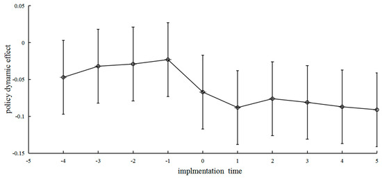 The DID model must meet the assumption of parallel trends, where the pilot and non-pilot areas follow similar trends before the policy implementation. This study uses the event study method to test the assumption of parallel trends (Figure 4). The horizontal axis from −4 to −1 represents the dummy variables for the four years before policy implementation, 0 represents the dummy variable for 2014, and 1 to 5 represents the dummy variables for the five years after policy implementation. The vertical axis represents the coefficient estimates. The coefficients for pollution and carbon reduction levels are not significant in the four years before the implementation of the CEPT, indicating no significant systematic differences between the pilot and non-pilot areas before the policy was implemented, thus meeting the parallel trends assumption. Additionally, the estimated coefficients after policy implementation indicate that the CEPT has a sustained effect on promoting pollution and carbon reduction in the pilot areas.