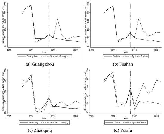 Figure 5 shows the fitting results of each pilot city’s pollution and carbon reduction levels before and after implementing the CEPT under the SCM model. The vertical dashed line represents the policy implementation time in the pilot cities. In contrast, the horizontal dashed and solid lines represent the synthetic and actual values of the pollution and carbon reduction levels in the pilot cities, respectively. By observing Figure 5 and calculating the root mean squared prediction error (RMSPE) values for each pilot city (Table 4), it can be seen that before the policy implementation, the actual and synthetic values of the pilot cities show roughly the same trend. After the policy implementation, the actual values are significantly lower than the synthetic values, further validating Hypothesis H1. Overall, the actual pollution and carbon reduction levels show a linear downward trend, while the synthetic values show a fluctuating upward trend. The two gradually diverge, and the difference between them gradually increases. Regarding individual policy effects in the pilot cities, Zhaoqing performs relatively well. At the same time, the pollution and carbon reduction levels in Guangzhou and Foshan have decreased but remain at relatively high levels. This individual difference may stem from varying responses to the CEPT in different cities, involving factors such as each city’s unique industrial structure, pollution source distribution, and specific details of policy implementation [26].