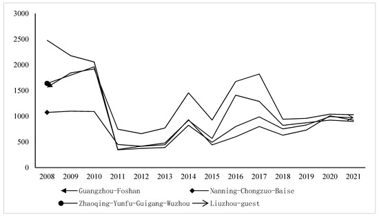 Significant differences exist among cities in the PRWREB regarding policy implementation, industrial structure, resource-carrying capacity, and economic development level. These differences may lead to heterogeneity in the pollution reduction and carbon reduction effects of the CEPT. According to the “Blue Book of the Pearl River-Xijiang River Economic Belt” and the “Development Plan of the Pearl River-Xijiang River Economic Belt” issued by the Central Committee of the Communist Party of China and the State Council in 2014, this economic belt is divided into four groups: Guangzhou–Foshan, Nanning–Chongzuo–Baise, Zhaoqin–Yunfu–Guigang–Wuzhou, and Liuzhou–Laibin. Figure 6 shows the evolution diagram of the four groups’ pollution and carbon emission reduction levels. Overall, the levels of pollution reduction and carbon emission reduction fluctuated and declined. With the introduction of the “Master Plan for the Development of the Guangxi West River Economic Belt” in 2012, “ecological priority” became the focus, and the PM2.5 in the economic belt dropped significantly. With the promulgation of the “Action Plan for the Prevention and Control of Air Pollution” in 2013, pollution and carbon emission reduction in the economic belt remained relatively low between 2011 and 2015. However, with the establishment of the Guangdong–Guangxi Cooperation Special Experimental Zone, the industrial development of the economic belt reached a climax in 2016, and the levels of pollution reduction and carbon emission reduction gradually increased. From an individual perspective, the variation range of the pollution reduction and carbon emission reduction levels in Guangzhou–Foshan is small, in line with the development characteristics of its mature industrialization stage. The pollution reduction and carbon emission reduction levels in other groups fluctuated greatly because they were still in the transitional stage from the initial to the middle stage of industrialization, where traditional industries occupied a dominant position, and there were contradictions between economic development and environmental protection.