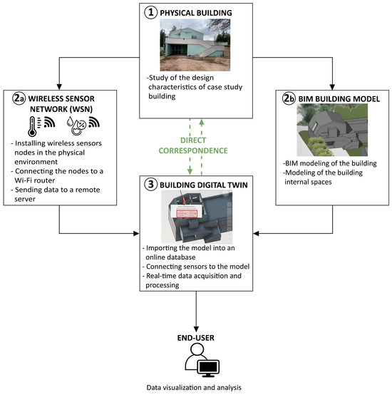 Thirdly, there is currently no standardized procedure capable of instructing and guiding the professional in the development of a DT. In the different studies analyzed, the system architecture for DT development has been presented generically, focusing specifically only on certain work phases, mainly related to the integration of sensors with the digital model and to the acquisition and visualization of monitored data. In our case, the developed workflow is explained in detail from the study phase of the physical building to the analysis and discussion phase of the monitored data. This approach was aimed at defining guidelines to facilitate the application of the workflow in a professional context, for each type of case study.